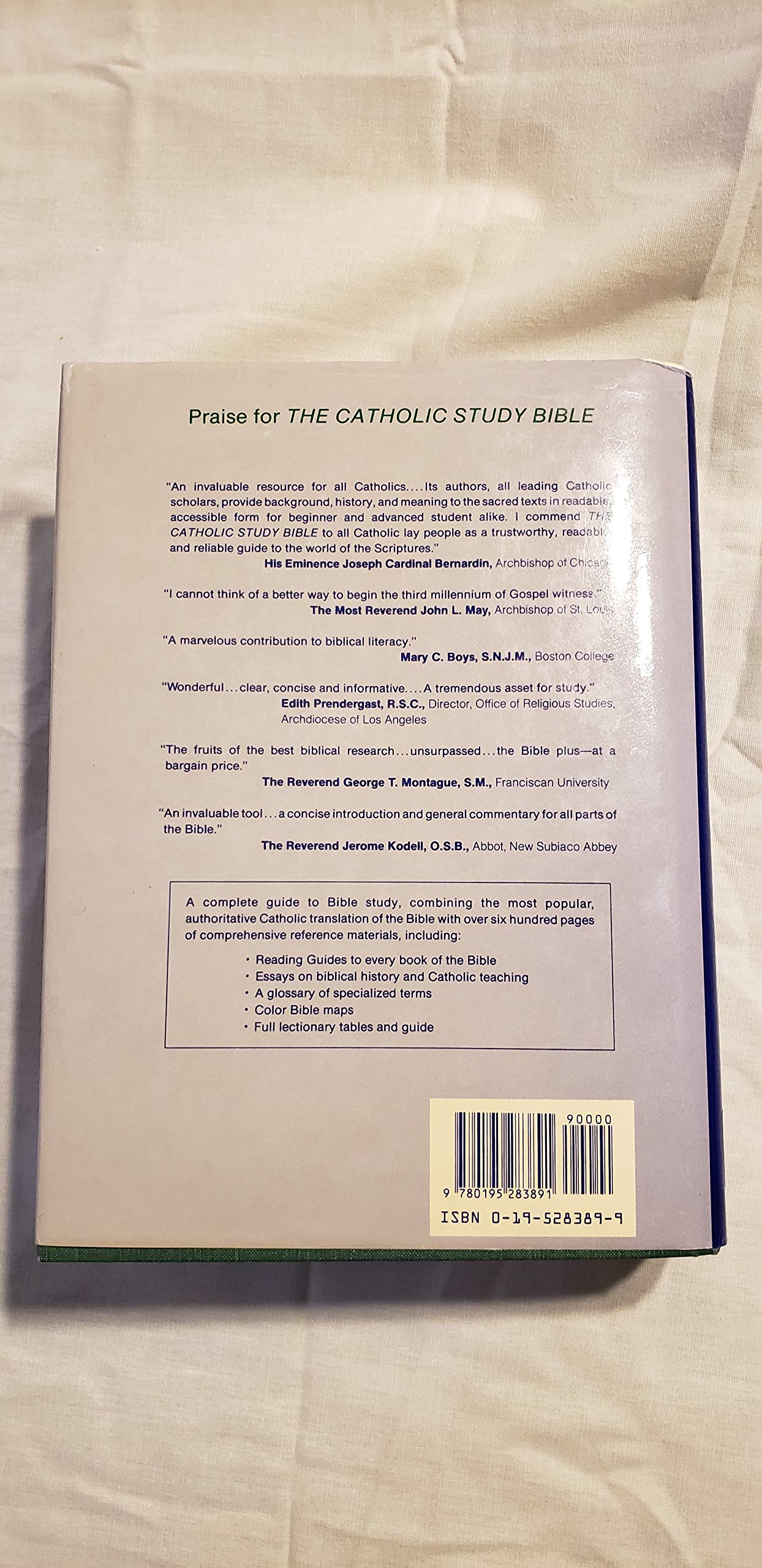 Details: The Catholic Study Bible was designed for advanced students of the Scriptures by today's top Catholic scholars. A nearly 600-page Reading Guide is linked to the biblical text by means of marginal references to specific pages in the Guide. Other features include: reference articles on key issues of Bible study, a glossary of specialized terms, the complete Sunday and weekday lectionaries, full color New Oxford Bible Maps, and a 70-page, select NAB Concordance.